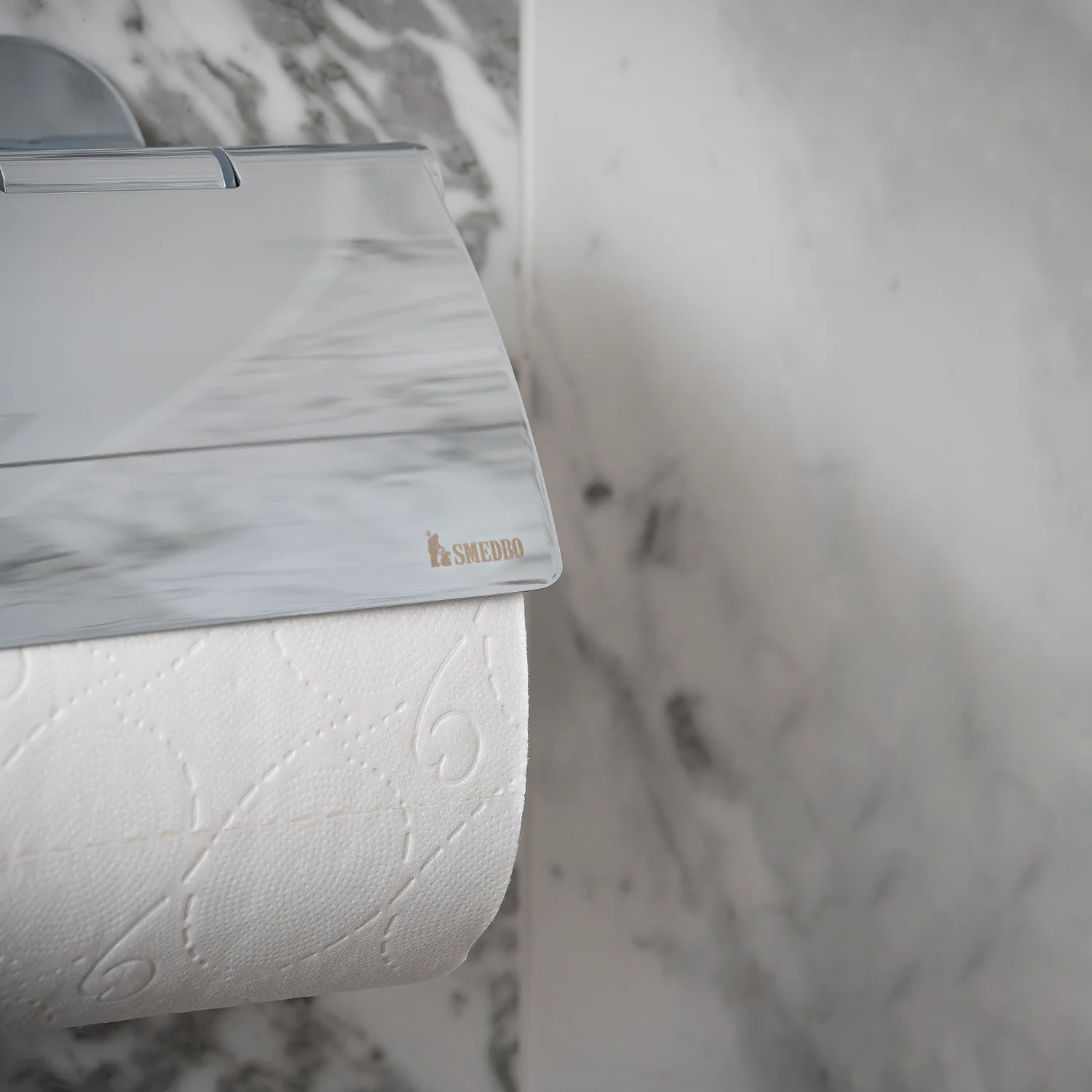 Sleek and practical toilet paper holder with a lid and a round self-adhesive backing plate. With this functional design, you no longer need to drill holes in the walls. Give your bathroom an upgrade and create a luxurious feel with polished chrome.